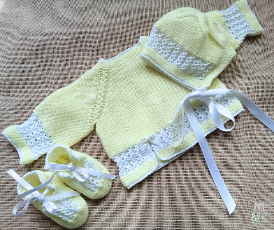 Conjunto de primera puesta para recién nacido, tejido a mano con hilo hipoalegérnico en amarillo. Incluye chambrita, gorrito y zapatitos.